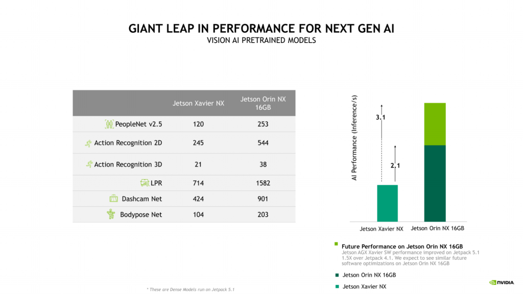 Bütün Jetson Orin modülleri, NVIDIA AI yazılımlarını destekliyor. Orin NX 16GB desteği ve Jetson Orin serisi için CUDA-X yazılımların yeni versiyonlarına sahip olan NVIDIA JetPack 5.1 sürümü yayınlandı.